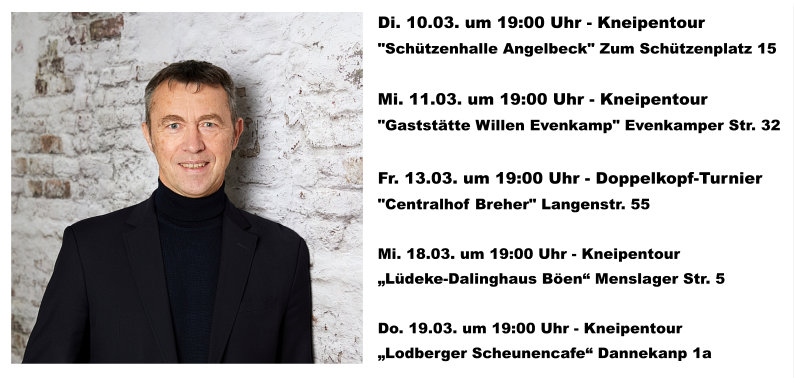Treffe Gerd, unseren Bürgermeisterkandidaten bei einer Kneipentour oder beim Doppelkopf