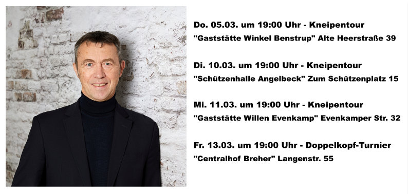 Hier werden alle Termine mit unserem Bürgermeisterschaftskandidaten bekannt gegeben. Egal ob bei einem lockeren Smalltalk und einem leckeren Bierchen oder beim Doppelkopf spielen.